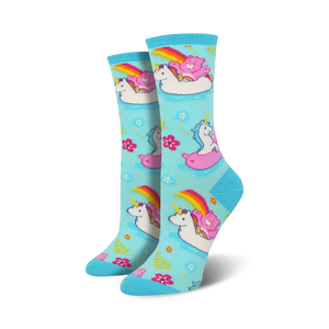 Did you get a flat tire? Miss breakfast? Stuck in the mother of all traffic jams with a migraine? Having a bad hair day? If you're having a down on your luck kind of day, these awesome socks will cheer you up! You can always count on a Care Bear to brighten up your day. Each cool pair of women's novelty crew socks features the adorable Cheer Bear hanging out with some unicorns. There are also rainbows and flowers printed all over on a mellow-looking, light blue background.