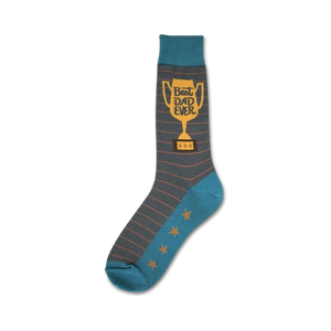 Proclaim your love for Dad with these socks to the world! Made with a combination of gray, blue, and white, these socks are made for men with an unyielding fondness of their paternal figure. The front of these crew-length socks emphasizes the phrase 'Best Dad Ever' above a trophy, while three stars accompany the text. Whether you're searching for a gift or looking to add to your collection, these socks will remind you that even Dad can have a few aces hidden up his sleeve.