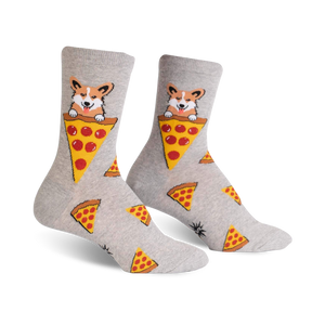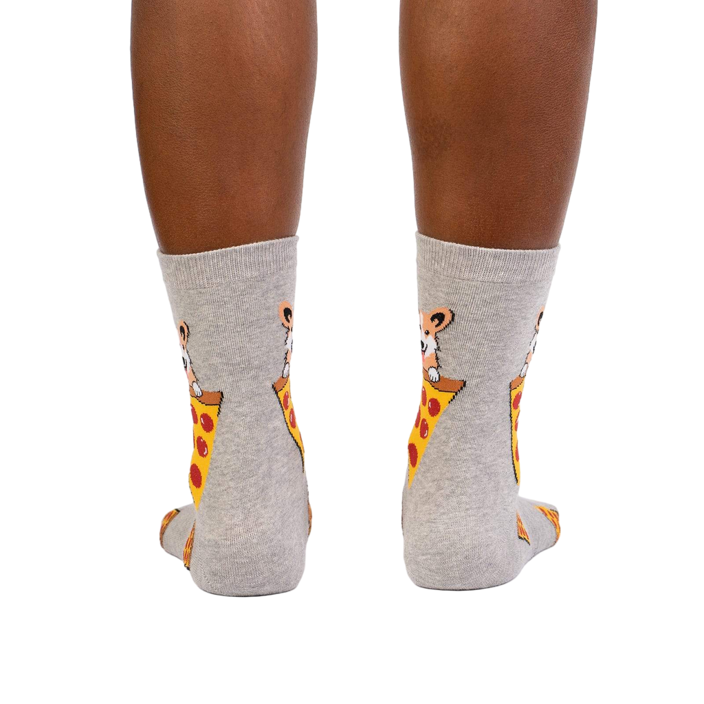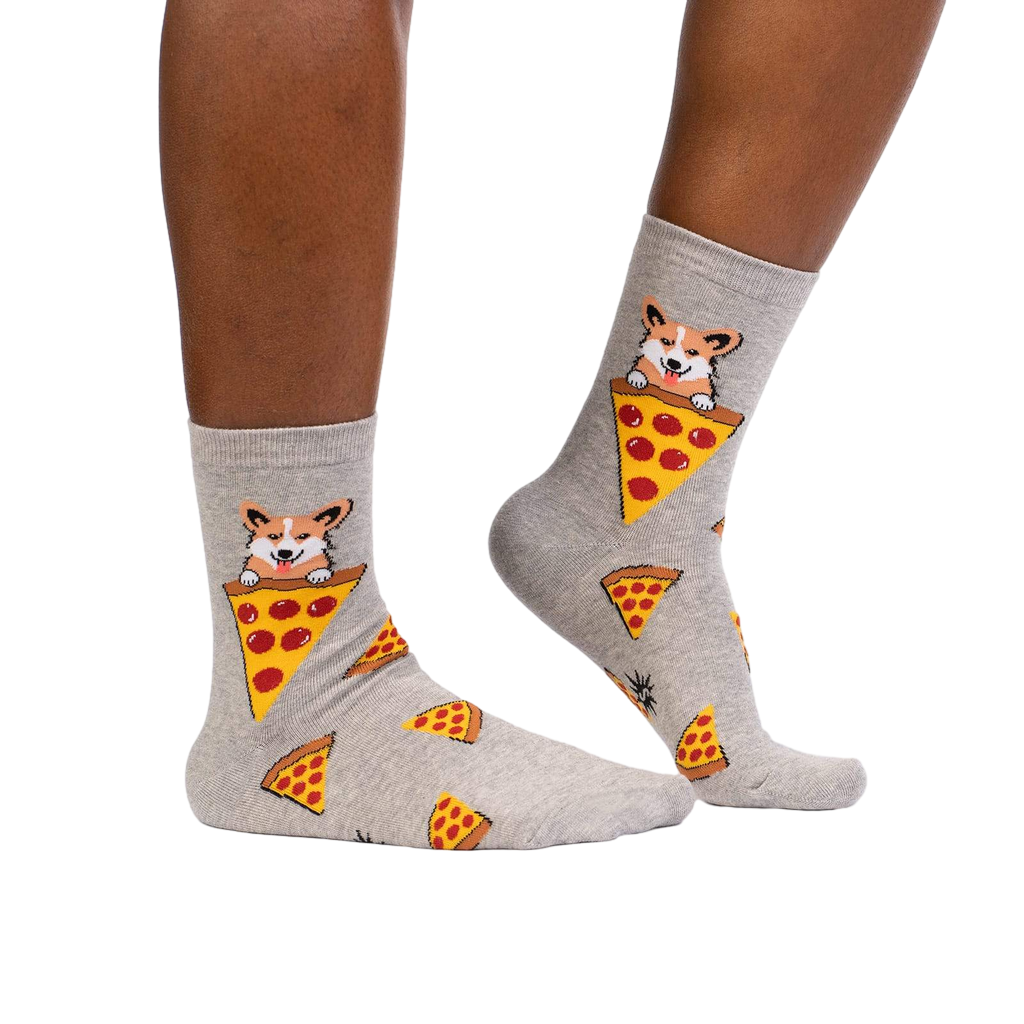 Put on a pizza party for your feet with these "Best Friends" novelty socks. With a pattern of cartoon pepperoni pizzas, single slices, and a corgi dog peeking out of the top, these gray crew socks are a fun and fashionable way to show your love for your furry best friend.
