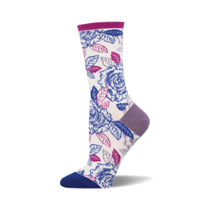 These socks feature a captivating design of blue illustrated roses paired with boldly unconventional dark pink leaves. But it doesn’t stop there; each pair boasts a vibrant blue toe, stylish grey heels, and a classic white background that makes the floral pattern truly pop. Perfect for those who appreciate a dash of daring with their dapper, "Bi Roses" socks are more than just a comfy fit—they're a conversation starter. Slip into a pair, and let your feet bloom with every step!