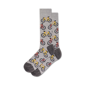 You'll be riding in style with our 'Bicycles' socks. These crew length gray socks for men feature a bright and detailed pattern of red and yellow bicycles. They're perfect for a casual day out or just lounging around the house. They're a great conversation starter. Did you know the bicycle was first called a velocipede? Pedal into your day with these fun and comfy socks.