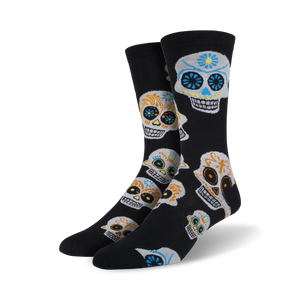 Celebrate the Day of the Dead- "Dia de Los Muertos- with an electric pair of muertos skull socks! Each cool pair of black crew socks features different sized sugar skulls with vibrant and festive patterns. You will have some very sweet feet while dancing with the dead! Available with red skulls or white skulls