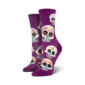 Show off your wild side in our Big Muertos Crew Socks for Women! Featuring a festive purple backdrop adorned with vibrant sugar skulls, these socks are sure to turn heads and put a smile on your face. Its bold pattern and colors are a playful nod to the Day of the Dead, reminding you to embrace life and remember those who've passed. Wear these on your next adventure, fiesta, or just a regular day for a touch of whimsy and cultural flair. They make a great gift for any sugar skull lover or anyone who appreciates unique and fun fashion.
