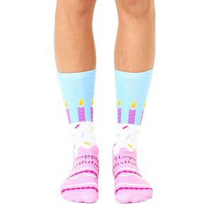 Calling all cake enthusiasts! Adorn your feet with these fun and festive Birthday Cake socks. Featuring a pattern of pink and purple birthday cakes with lit candles against a blue background, these socks are sure to make you the life of the party. Put on a pair and celebrate your special day in style!