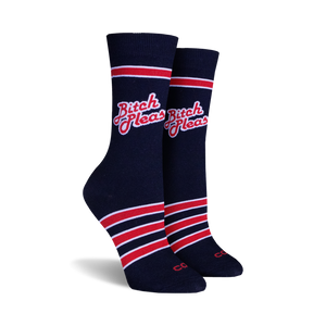 Bitch, please. You can't wear just any old socks, you need socks that make a statement. These sassy socks are made for the bold and fabulous. With their dark blue background, red and white striped accents, and "Bitch Please" emblazoned across the front, these socks demand attention. Grab a pair and show the world who's boss.