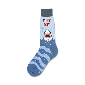 Feel like a biter in these gray "Bite Me" socks featuring an open-mouthed shark that looks like it's nibbling your leg. Made just for men, relax in these fun but hardy crew-length socks. Rock your new shark socks the next time you're out on the prowl and let everyone know that you're fun and ready to show off your sharp style.