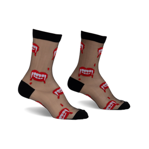 Forget plain socks, these are here to make a statement. They're a sheer black material, letting your skin peek through, with a playful pattern of bright red lips showing off stark white vampire fangs. Each set of fangs has a few little red drips, adding to the spooky vibe. The toe, heel, and cuff are solid black, contrasting nicely with the transparent main body. Perfect for when you want a little edge without going full costume, or just to surprise someone with a subtle, fun detail. They're definitely not boring, and they tell everyone you've got a bit of bite.