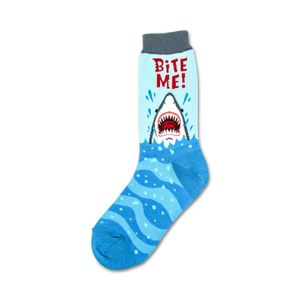 Dive into the deep end of fashion with our "Bite Me" socks! Featuring a cartoon shark bursting from splashing waves, these socks will make a splash wherever you go. Show off your wild side while keeping your feet cozy and protected.