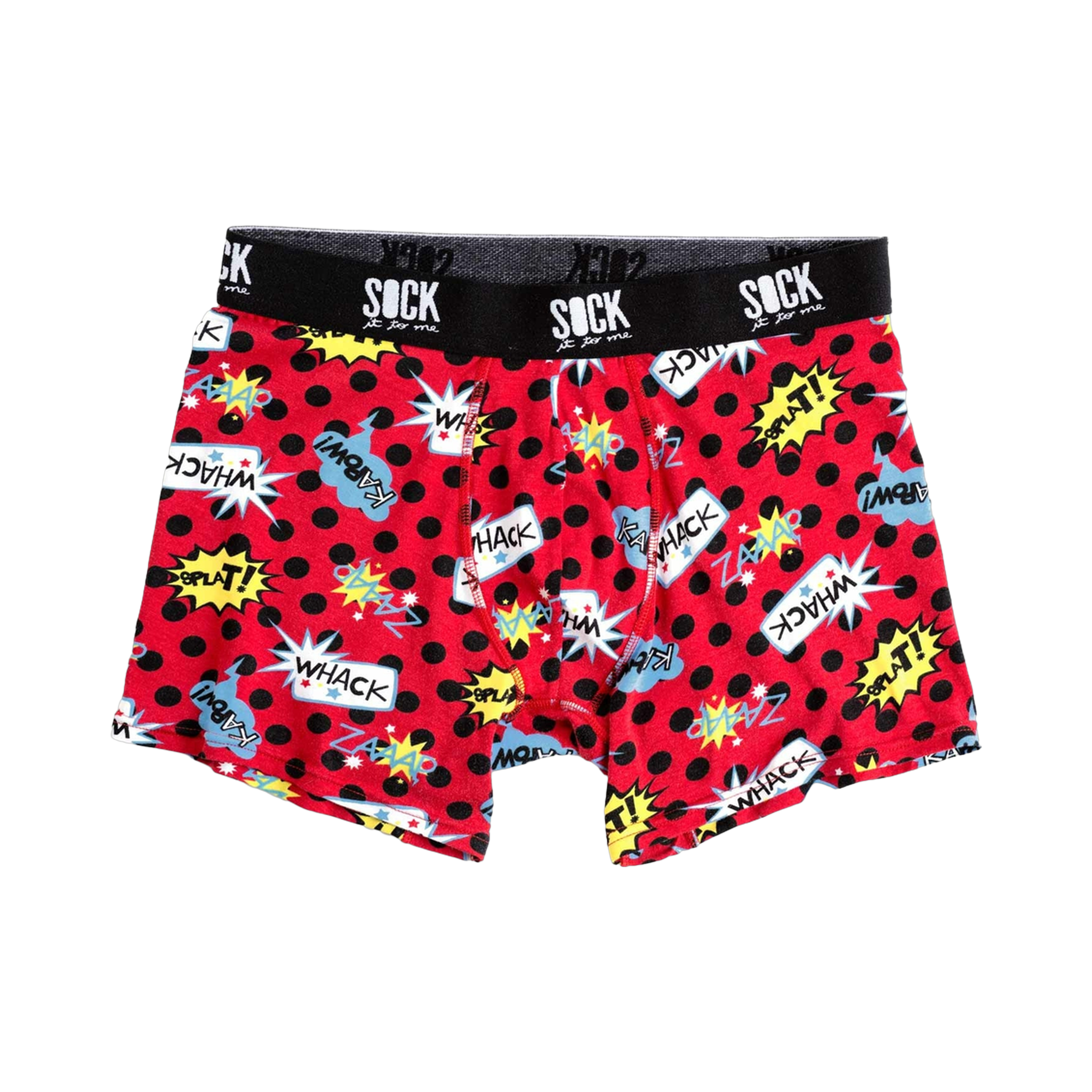 Ka-pow! Kick start your day with a dose of action! This cool pair of men's boxer briefs come in a red and black polka-dot pattern with several retro comic action stickers on the front side and back side. You will be reliving your glory days of being a kid all over again!