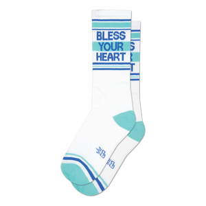 These white crew socks are ready to add a bit of playful wit to your day. Up top, you’ll find a classic ribbed cuff, followed by horizontal stripes in light aqua and dark blue. The front prominently features the phrase “BLESS YOUR HEART” in bold dark blue letters, giving off that perfect polite-but-sarcastic vibe. Down toward the toes, the sock transitions to a solid aqua color, accented with a few thin dark blue and aqua stripes just above it. On the visible side of the foot, there's also a small, abstract blue design. They are a fun way to share a little Southern charm.
