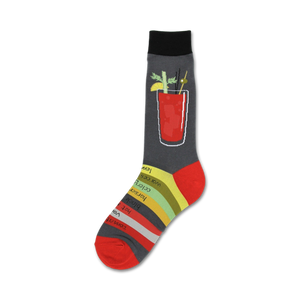 Bloody Mary socks: the perfect way to add a little fun to your sock drawer. These gray socks with multi-colored stripes at the top and a Bloody Mary drink with a celery stalk and olive on the front, are sure to make you smile every time you put them on. Whether you're a fan of the classic cocktail or just like fun socks, these are sure to be a hit. After all, they're like a party in a sock, minus the hangover. Cheers to that!