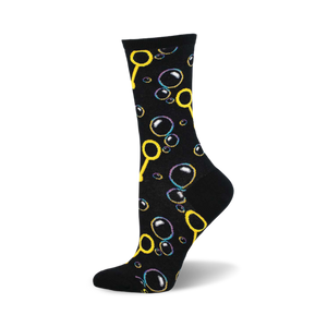 Remember the sheer joy of blowing bubbles as a kid? These "Blowing Bubbles" socks capture that playful magic with colorful bubble and bubble wand designs floating against a sleek black background. Perfect for anyone who loves to add a touch of nostalgia and fun to their day, these socks bring a pop of color and childhood charm to every step.