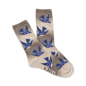 Yep, the bird's the word with these feathered friends - the Blue Bird Socks! Flock to wherever your day takes you in these tan colored socks featuring a happy line up of little blue birds with pink bellies. The only thing missing is the worms! With a reinforced heel and toe to make sure these socks last until your next big adventure, these are perfect for any birdwatcher and nature lover. Styled with a ribbed cuff, this women's crew length socks are the nest choice for casual comfort.
