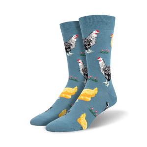 Kick your wardrobe up a notch with our Bock Bock Crew Socks. These bad boys feature a hilarious pattern of cartoon chickens and eggs on a brilliant blue background. Perfect for the poultry-lover in your life, these socks will have you strutting your stuff like a proud rooster. Plus, they're made for men, so you know they'll provide all the comfort and support you need to take on your day, one clucking step at a time.