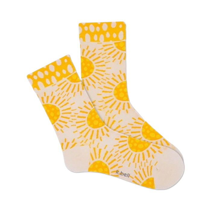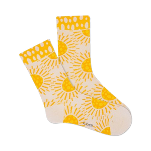 Boho Sun Spots: Rock your happy place with our sunny crew socks! These white socks are scattered with cheerful yellow suns, each with a cute face and triangular rays. They're like tiny suns warming your feet, reminding you to stay positive and radiant. Perfect for any boho-loving fashionista who wants to add some sunshine to their day.