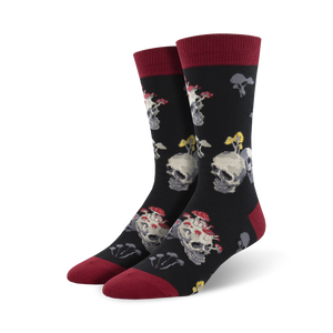 Behold! Bone Heads - Mens Crew Socks: A kaleidoscope of spooky skulls and vibrant mushrooms set against a black backdrop. Their red toes and heels add a dash of devilish charm. Slip into these creepy-crawly companions for a Halloween bash or rock them as your daily dose of eerie elegance.