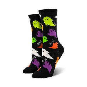👻Party With the Colorfully Boo-tiful!👻 These socks are a BOO-tiful addition to any spooky wardrobe. With their bold black background and vibrant white, purple, green, orange, and yellow ghosts, they're a guaranteed conversation starter. Made for women, these fun crew socks are perfect for a Halloween costume or a night out with friends. Plus, they're so comfortable, you'll want to wear them all night long!