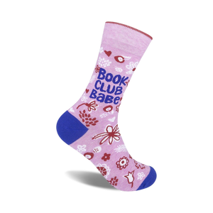 Bright pink socks with blue toes, heels, and cuffs are fabulous for bookworms! With the words "Book Club Babe" adorning the cuff, these book-themed socks also boast a floral print in various shades of pink, yellow, orange, and red with green leaves. Perfect for any literary lover, these socks will make a statement wherever you go!