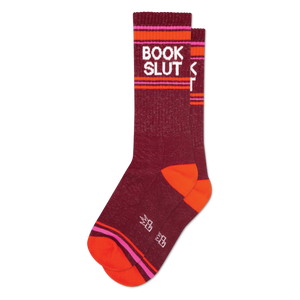 The cozy base of these socks comes in a rich burgundy color. Up top, the cuff features bright orange and hot pink stripes. On the visible shin, "BOOK SLUT" is knit in crisp white letters, making your statement clear. The toe and heel areas switch to a vibrant orange, adding a fun contrast. On the sole, you'll spot a few small, abstract white symbols. They're an unmistakable way to show off your love for reading, just right for curling up with a novel or tackling your daily errands.