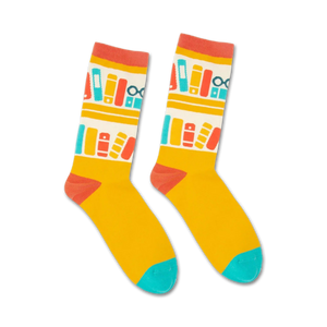 With these bookworm beauties gracing your tootsies, you'll be reading socks appeal! These vibrant yellow socks feature a bookshelf design with books in bright blue, orange and redperfect for when you need a literary lift!