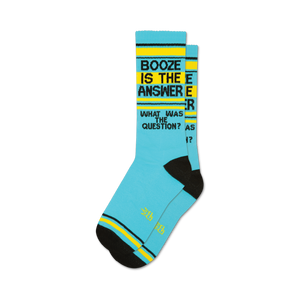 Raise a glass to the Booze is the Answer socks! Let your feet do the talking in these playful blue socks with black toes, heels, and cuffs. Featuring bright yellow stripes and the words "Booze Is The Answer" on one sock and "What Was The Question?" on the other, these socks are sure to make a statement. Whether you're hitting the town or kicking back at home, these socks are the perfect way to show off your love for a good time. Remember, the answer is always booze! Socks sold as pairs.