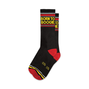 Strut your funk in these 'Born to Boogie' socks! Rock a vibrant combo of black, red, and yellow stripes, with the iconic phrase dancing across the front. Put on a pair and let the irresistibly catchy tune of your style play on. Available in Crew for both men and women, these socks are perfect for those who were, indeed, born to boogie. Remember, life's a dance, so put on your boogie shoes (or socks) and groove it!
