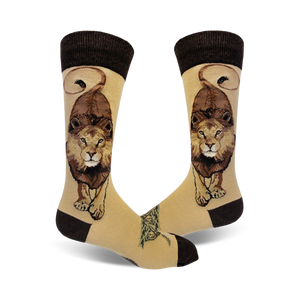Roar into your day with the Boss Lion Socks. The king of the jungle is here to add a dash of fierce style to your feet. Made for men with crew-length coverage, these socks feature a light tan base with a dark brown top and a pattern of a lion's face. The lion's dark brown and light yellow features are striking against the background, and the dark brown mane adds a touch of regality. Plus, the small green leaf pattern adds a touch of nature to your look. Get ready to take on the world, one fierce step at a time.