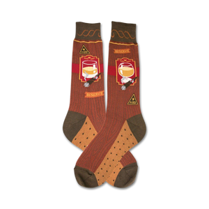Bourbon and Cigar socks - For the whiskey and cigar fanatic. Picture this: A snifter of brandy or cognac on each foot smells delicious with a thick cigar on top, framed with a red and white striped border, just like the ones at the bar. All this on a sturdy pair of brown socks with small polka dots. You might want to grab a pair of these Bourbon and Cigar socks just to keep one as a delightful reminder of that time you got a finger in your brandy, and a burn on your mustache!