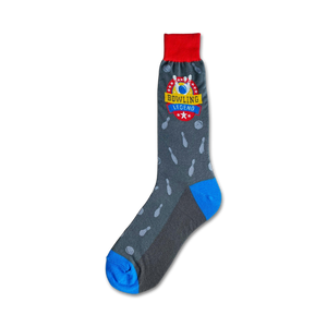 Roll a strike with these legendary bowling socks! Perfect for the bowling enthusiast in your life, these grey crew socks have a fun pattern of bowling pins with red and blue accents. Impress your friends at the next bowling night or just relax in style at home. Whether you're a seasoned pro or just a casual bowler, these socks are sure to be a hit!