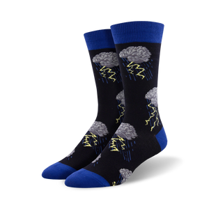Get ready to let your feet shout "Brain Storm!" as they're enveloped by a black sky decorated with stormy clouds outlined by striking black and illuminating yellow lightning bolts. These crew socks are designed to electrify your style so you leave everybody thunderstruck. So next time the clouds in your head start brewing, put on these socks and watch your day brighten up.