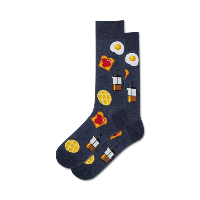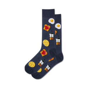 Brighten your day with our Breakfast socks! Featuring a delightful pattern of waffles, eggs, toast with jam, and coffee pots, these socks will add a dash of fun to your feet. They're perfect for any breakfast lover who wants to add a touch of whimsy to their wardrobe. So grab your cup of joe and slip into a pair of Breakfast socks your feet will thank you!