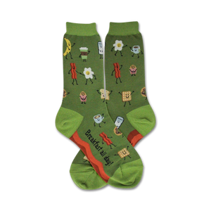 Breakfast all day, every day! These fun and funky socks feature a vibrant pattern of breakfast-themed items like eggs, bacon, toast, coffee, and more. With the words 'Breakfast all day!' proudly displayed, these socks are the perfect way to show your love for the most important meal of the day. Whether you're eating breakfast at home, on the go, or even in your dreams, these socks have got you covered! Plus, who knows, they might just inspire you to try something new for breakfast, like avocado toast or a green smoothie. Talk about #BreakfastGoals!