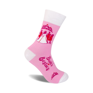 Get your feet ready to party with our "Bride's Besties" crew socks! Splashed in playful pink and white, these socks are your official badge of honor in the bridal squad. Decked out with a cheeky bride and her bridesmaids silhouette, they're the ultimate accessory for the big day or the wild bachelorette bash. So, slip into these bad boys and let's kick the celebration up a notch – because every step should be as fun as the wedding cake is sweet!