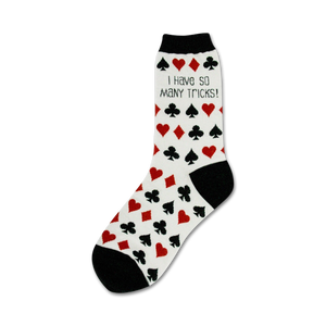 Calling all card sharks and game enthusiasts! Step into our Bridge socks, featuring an array of red and black card suits in a vibrant pattern. With their bold design, they'll make you the ace up your sleeve at any game night. Plus, with the cheeky phrase 'I have so many tricks!' proudly written on top, you'll always have a secret weapon concealed in your sock drawer. Let the good times roll!