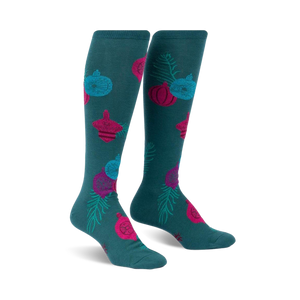 Put on a pair of the knee-high Bring the Bling socks and watch your holiday spirit jump up a few notches. The teal base is covered with variously-colored Christmas ornaments and pine sprigs, giving you an instant burst of festive cheer.
