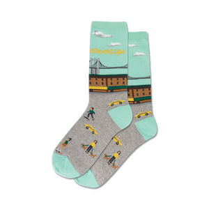 Get ready to ride the waves of style with our Brooklyn socks! Take a stroll through the bustling streets, where yellow taxis zip by and dog walkers strut their stuff. Skateboarders catch some air as the blue sky and bridge complete the scene. When you pull on these crew socks, you'll tap into the vibrant heartbeat of Brooklyn, no matter where you are. Let your feet do the talking and showcase your love for the Big Apple. Remember, in the concrete jungle, it's all about keeping your toes cozy and chic!