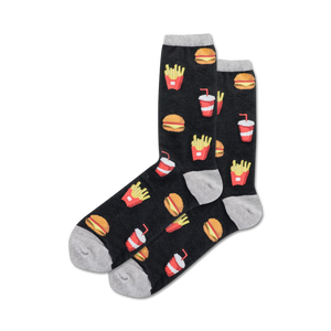Chow down on these Burger and Fries crew socks for women! They'll satisfy your cravings for fashion and fun. The black socks are printed with a pattern of burgers, fries, and soda in juicy red, yellow, green, and brown. Wear these socks to your next cookout, burger bash, or fast-food feast. They're sure to be a hit with friends and family.