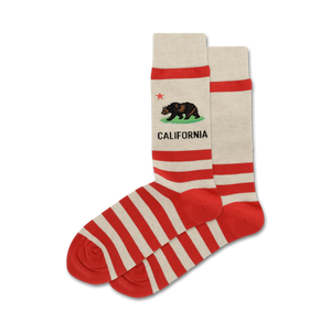 Calling all rad Californians! Ready to bear-ify your feet? These red and white striped crew socks feature the one and only Cali bear, making them the perfect way to stay comfy and stylish while rep'n your home state. So grab your socks and get ready for a California adventure, dude!