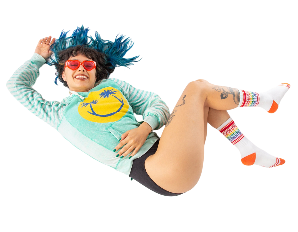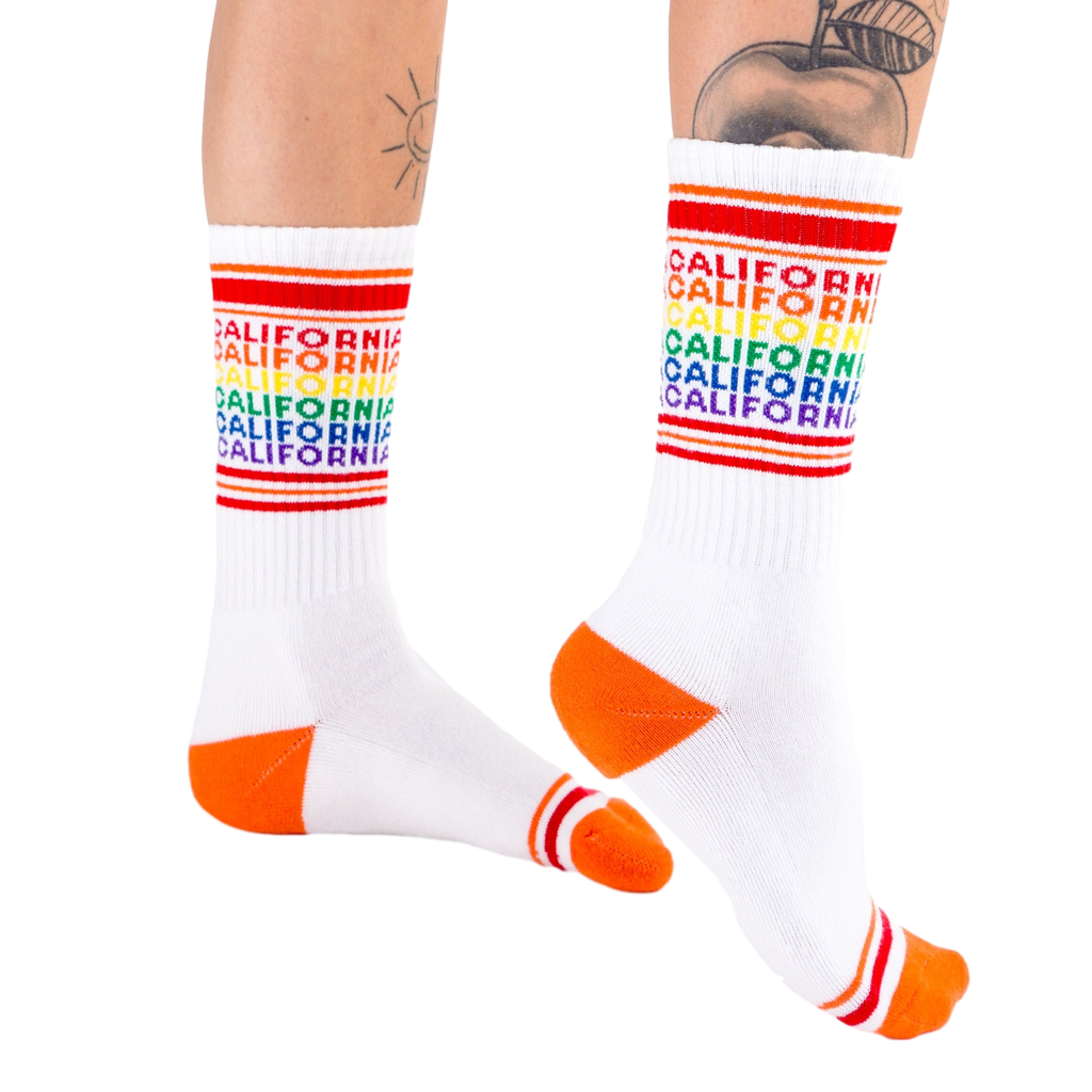 Show your love for the Golden State with these California rainbow state socks! White and rendered in big, fluffy letters stacked from toe to the top cuff of the socks, the word "CALIFORNIA" comes alive in neon orange, blue, yellow, and green. Two orange stripes adorn each sock above the ankle and an orange toe and heel completes the look. These extra long crew length socks are perfect for any native, transplant, or future sunshine state enthusiast!