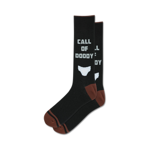 The Call of Doody socks are a must-have for parents who have a sense of humor about the realities of parenting. These eye-catching black socks with brown trim feature a hilarious graphic of a pair of white underpants with a brown skid mark and the text "Call of Doody." Whether you're dealing with a toddler's potty-training mishaps or a teenager's stinky feet, these socks will remind you to laugh through the mess.