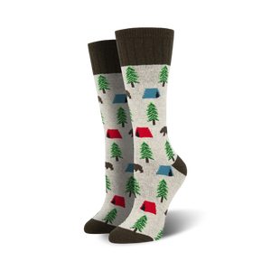 Pitch a tent, grab a bear, and take a hike with these delightful Camping Wool socks! With red and blue tents, green pine trees, and brown bears on a light gray background, they're the perfect way to bring the great outdoors with you wherever you go. And with their brown tops, they're sure to make a statement. Whether you're hitting the hiking trails or just lounging around the campfire, these socks will keep your feet warm and cozy. Plus, they're made for both men and women, so you can share the camping fun with your friends and family.