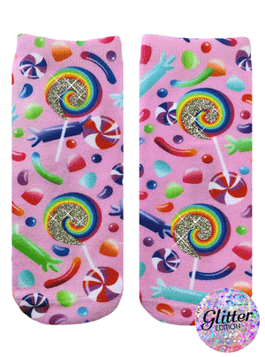 Candy-colored ankle socks with a sweet tooth! Feast your eyes on pink socks decorated with arrays of lollipops, hard candies, gumdrops, and jelly beans. A dash of silver glitter on the lollipops adds a touch of sparkle, making them perfect for ladies who love a bit of sugary fun in their wardrobe. Your sweet-toothed feet will crave these socks!