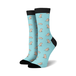 Get ready to dive into cuteness with Capybara Crew Socks! These blue socks are adorned with a pattern of cartoon capybaras swimming in a light blue pond. Capybaras are the world's largest rodents, but don't let their size fool you. They're known for their playful and friendly nature, just like these cozy socks. Available in sizes for both men and women, these socks are the perfect way to add a touch of fun to your everyday wardrobe. Slip into a pair and let the capybaras take you on a whimsical adventure with every step.
