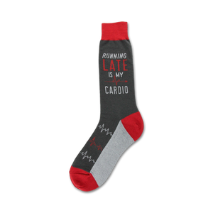Cardio. Your new workout socks that keep the jokes fresh and your feet fly. These crew-length socks are gray with red toes, heels, and tops and knitted with the words "Running Late is My Cardio" in red. We all know that cardio isn't always "fun" but these socks are sure to give you a grin each wear. Think of them as a fun reminder to take it easy, you can't always be in shape!