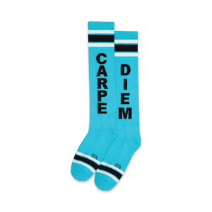 Kick your wardrobe into high gear with our super rad Carpe Diem knee-high XL socks! Decked out in blue with snazzy black and white stripes at the top, these socks feature the inspiring words 'Carpe Diem' in bold black. Wear them and feel the rush of adventure surge through your veins as you seize each day with unparalleled passion. These toe-riffic socks fit both men and women, so whether you're conquering mountains or tackling your to-do list, they will keep your feet feeling fly and focused. Don't miss out on these nifty socks that are equal parts fun and motivational - add them to your fashion arsenal today!