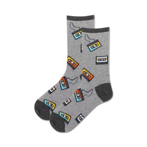 Tape it or leave it. Take a walk on the wild side in these Cassette Tape Crew Socks. Bold and colorful, these socks feature an all-over pattern featuring your favorite mix tapes from back in the day! They're the perfect accessory for anyone who loves music.
