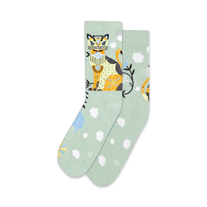 Cat & Clouds Crew XL Socks: Unleash Your Inner Feline Charm! Cruise through the day in these "Cat & Clouds" socks that bring a dash of whimsical fun to your feet! Adorned with mischievous orange cats frolicking amidst fluffy white clouds against a refreshing mint-green backdrop, these socks are sure to be-cat-ch your fancy! Whether you're lounging at home or strutting your stuff on the town, these comfy, crew-length socks are the purr-fect way to showcase your paws-itivity! Step into a world of feline enchantment with Cat & Clouds socks, and be prepared to steal the spotlight, one paw at a time.