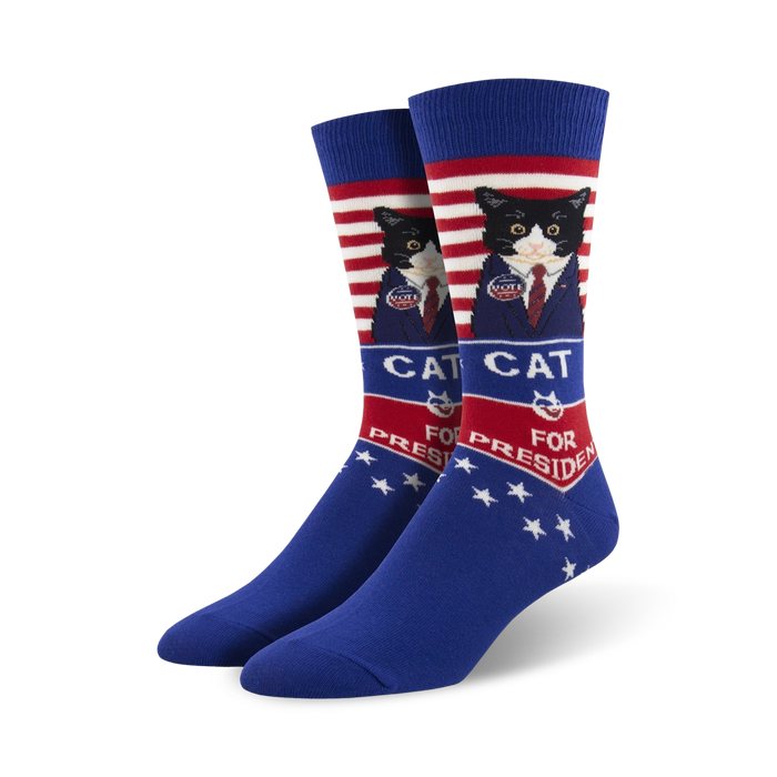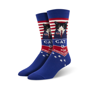 Cat For President Socks: Show Your Support With Socks! These red, white, and blue socks feature a suited cat running for president. With five stars on each side of the word "PRESIDENT" and the cat wearing a vote button, these socks will get you ready for election day in style.