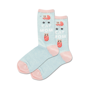 Cat Mom Socks: Purrfectly Pawsome! Strut your stuff with these Cat Mom socks, featuring cute cats pushing tiny human babies in strollers! Show off your love for felines and motherhood with these fun and light blue socks with pink accents. These crew-length socks are perfect for any cat mom who wants to add a touch of whimsy to her everyday style.