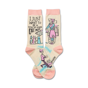 Cat Mom Socks: Let your love for felines run wild in these cozy crew socks! Featuring an amusing illustration of a multitasking cat mom cooking in a pink apron while on roller skates, surrounded by her four adorable feline friends, these socks will bring a smile to your face. The words "I Just Want To Be a Stay At Home Cat Mom" are boldly printed in black, serving as a lighthearted reminder of your domestic bliss with your furry companions.